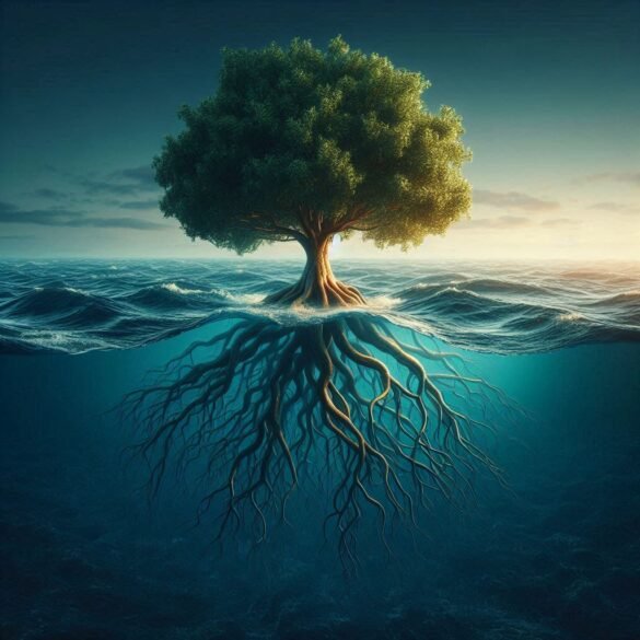É no inesperado que reside a poesia. O mar repousa, suas ondas dançam — tudo parece familiar, até que, ao fundo, surge uma árvore. Sim, uma árvore no meio do oceano. Serena. Firme. Digna. A imagem nos convida a parar, respirar e mergulhar dentro de nós mesmos.